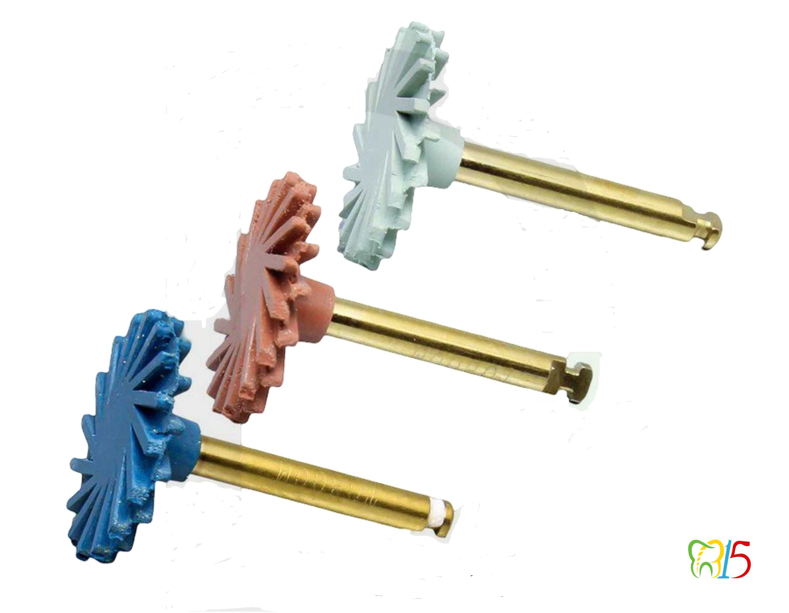 ابزاری حیاتی برای پالیش نهایی ترمیمهای زیبایی. این دیسکهای منعطف که ساختاری شبیه به خورشید، فرچه یا چرخدنده مارپیچی دارند، اغلب از جنس سیلیکون ساخته شده و حاوی ذرات بسیار ریز الماس هستند. این ساختار فرچهمانند به دندانپزشک اجازه میدهد تا سطوح نامنظم، فرورفتگیها (مانند شیارهای اکلوزال) و زوایای خطی ترمیم را به طور کامل صیقل دهد و به براقیت و درخشندگی نهایی (High-Shine Gloss) برسد. کاربرد اصلی آنها در پالیش کامپوزیتها و روکشهای پرسلنی است و معمولاً نیاز به استفاده از خمیر پالیش جداگانه را از بین میبرند. در گریدها و رنگهای مختلف (مثل صورتی، کرم، خاکستری یا آبی) برای مراحل پیشپالیش (Medium) تا براقیت نهایی (Fine) موجود هستند.